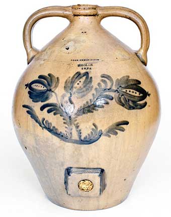 MONUMENTAL EIGHT-GALLON STONEWARE PRESENTATION COOLER, with Elaborate Cobalt Floral Decoration, Impressed "DOCT. LEWIS RIGGS / HOMER / 1836", and "CHOLLAR & DARBY / HOMER / 1836", Signed "M.W", Madison Woodruff at the Thomas D. Chollar and Joseph Darby Pottery, Homer, NY, 1836, large-sized, highly-ovoid cooler with square bunghole, ribbed handles, and tooled spout, decorated with a series of tulips with spotted interiors, extending from a leafy base. Brushed cobalt highlight around bunghole. Cobalt highlights to lower handle terminals. Impressed on front with the cobalt-highlighted inscription, "DOCT. LEWIS RIGGS / HOMER / 1836". Reverse with impressed and cobalt-highlighted maker's mark, "CHOLLAR & DARBY / HOMER / 1836”.
