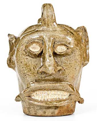 EXCEEDINGLY RARE AND IMPORTANT ALKALINE-GLAZED STONEWARE FACE HARVEST JUG, Edgefield District, SC, circa 1845-1870, ovoid form of arched handle and applied tubular pouring spout on reverse with semi-squared mouth, the front decorated with a hand-modeled and applied clay face. The face features kaolin eyes applied within elliptical eyelids, an open mouth bearing carved kaolin teeth and flattened lips, an applied mustache formed from twisted pieces of clay, a well-sculpted nose with pointed tip and carved nostrils, and large ears with applied tragi. The face's striking, lunate form with flared, high-set cheek bones, was created by gently depressing the surface of the jug while the clay was still soft. An arched ridge scored above the face, an unusual treatment, delineates the figure's forehead. The surface features a colorful green alkaline glaze with sporadic iron spotting. This recently-discovered work is among the finest known face vessels produced in the Edgefield potting tradition, and the best example of this distinctive Southern ceramic form that we have ever offered. The piece's large size, desirable harvest jug form, and expressive face with twisted mustache, create an object of both extreme rarity and strong folk art appeal. Its wonderful fu-manchu-style treatment is nearly unprecedented in Edgefield face jug production, and is stylistically related to that seen on the iconic face jar or umbrella stand, attributed to the Miles Mills Pottery, in the collection of the High Museum in Atlanta, GA. A second, small-sized monkey jug with similar mustache was also sold in The John Gordon Collection of Folk Americana, Christie's, Jan. 15-19, 1999. The example to be auctioned joins a small, highly-prized group of face harvest jugs, all with similar mouths, glazing, and pupil-less eyes, believed to have been made at the same pottery. Among these are two published examples currently held in the collection of the Museum of Fine Arts Boston and the High Museum. When comparing all from this group, the face jug to be auctioned arguably exceeds all other known examples in the expressiveness of the face and sophistication of its sculpting. Southern stoneware objects of this quality rarely become available for public sale. Standing as one of the very best examples of a coveted South Carolina form, the importance of this work is difficult to overstate. Literature: For related examples by the same school or maker, both lacking mustaches, see Baldwin, Great and Noble Jar, p. 81, fig. 3.10 and rear cover. Provenance: A recently-discovered example, found in the estate of Clive W. Bridgham (1951-2018), Barrington, RI, a descendant of Samuel W. Bridgham (1775-1840), the first mayor of Providence, Rhode Island. This jug was found along with a second large-sized Edgefield face jug, sold as lot 28 in Crocker Farm's July 21, 2018 auction. Possible early owners of the jug include any of Bridgham's three sons, Samuel (1842-1915), Joseph (1845-1915), who served during the Civil War in Company K of the Seventh Regiment of the New York State militia, or William (1849-1916). Samuel W. Bridgham's nephew, Capt. Thomas Paine (1786-1859), may have been responsible for bringing both jugs from South Carolina to Rhode Island. An excerpt from the "Manufacturers' and Farmers' Journal," Providence, RI, Nov. 14, 1859, p. 1, reads as follows: "Capt. Thomas Paine, whose death was noticed yesterday, was a gallant officer of the American navy, and a genial and kind hearted man. He was born, we believe, in Massachusetts, but for many years lived in Savannah and in Charleston. He was a nephew of Samuel Bridgham, the first mayor of Providence, and he occasionally visited this city, where many of our readers remember him. We shall doubtless find in the Savannah or Charleston papers a memoir of his life, and a fitting tribute to this worth." The journal's passage not only draws a familial connection between South Carolina, the state in which the jugs were produced, and Rhode Island, the jugs' ultimate resting place; it also indicates a possible means by which the jugs traveled to New England, as Paine "occasionally visited [Providence]," presumably as a ship's captain. Another possible owner was Paine's son, Edward Tatnall Paine, (1824-1908), a prominent Charleston cotton farmer and rice planter. His obituary in The Atlanta Constitution, August 23, 1908, reads, "Captain Edward Tattnall Paine, the oldest lineal descendant of Governor Landgrave Smith, of South Carolina, died at the residence of his son, Thomas B. Paine, at East Lake, Friday night at 12 o'clock. Captain Paine came to Atlanta two weeks ago to pay a visit to his son, and had been here only a few days when he became ill. Captain Paine was 85 years of age and was born in Charleston, S. C. His father was Captain Thomas Paine, of the United States navy and his mother was Mary Lucia Bellinger, a grand-daughter of Governor Landgrave Smith. Before the war he was a cotton factor and a large rice planter, and for many years he was captain of the famous Charleston Light Dragoons. He was one of the few surviving members of the old St. Cecelia Society of Charleston. He was married to Miss Julia Faber Beckley, of Charleston, a grand-daughter of Charles Desel, of the old Huguenot family of that name, one of the oldest families in South Carolina." Edward Tatnall Paine's obituary indicates he was linked to Charleston High Society by marriage and membership in at least two organizations: the Charleston Light Dragoons, an exclusive militia of privileged Charlestonians, which dated back to the 18th century and was ravaged by Grant's troops at Richmond, and the St. Cecelia Society, which began as a private concert organization, but, by 1820, had essentially become a social club for South Carolina's elite. Paine was thus connected to two opposing ends of the social spectrum. On one end, as a grower of cotton and rice, he regularly interacted with African-American slaves, a group popularly link