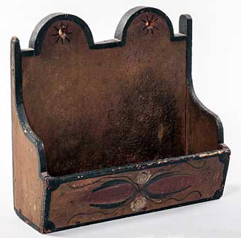 PAINT-DECORATED WALL BOX, America, 19th century, double arched hanging brackets on a rectangular back, shaped sides, and outward sloping front, soiled ochre-painted surface with black border, the front with floral motif, with evidence of older salmon-painted surface below, ht. 12, wd. 12.375, dp. 5.25 in.