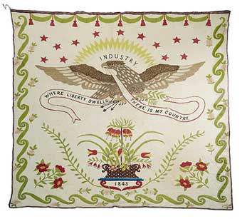 APPLIQUED PATRIOTIC COTTON QUILT, dated 1845, Appliqued inscription "Industry" and "Where liberty dwells there my country is," above an American Eagle and flower filled vase, within a tassel and swag, scroll and flowerhead border, worked with various printed cotton pieces and heightened with conforming and diamond quilting, 88 in. x 82 in.