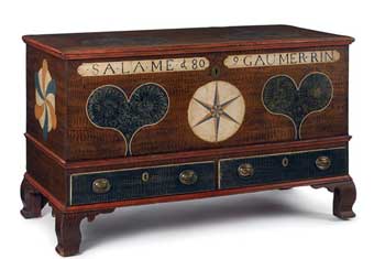VIBRANT LEHIGH COUNTY, PENNSYLVANIA PAINTED DOWER CHEST, inscribed Salame Gaumerrin 1809, having two hearts on the lid which repeat on the front panel, centering a six-pointed star over two stippled drawers, the end panels with three color philphlots, all resting on ogee bracket feet, 30.25" h., 47.75" w., 22.25" d. For a similar example, see Fabian, The Pennsylvania German Decorated Chest, pg. 176, figure 180. Sold at Pook & Pook, April 20,2013, lot 536.