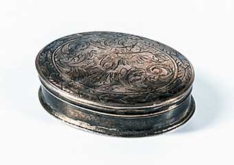 SAMUEL VERNON SILVER PATCH BOX, Newport, Rhode Island, c. 1725, the oval box with engraved phoenix on the lid inside a leaf border, engraved on the bottom "BH," the inside of the lid and base of box marked "SV" in a sunken cartouche, wd. 1.75 in., approx. 0.6 troy oz.
