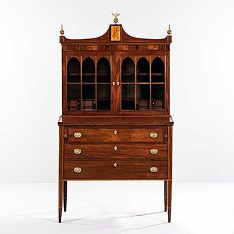 Condition: Replaced finials, some glazed windows replaced, minor inlay repairs, bead strip along upper left side edge of top section missing. Refinished. Brasses replaced. Pediment is original. There are two remaining from an old set of finials, including the eagle.