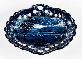 STAFFORDSHIRE HISTORICAL BLUE TRANSFER-DECORATED "BATTLE OF BUNKER HILL" TRAY, Ralph Stevenson, Cobridge, England, c. 1820, the oval tray with wavy rim and pierced edges, the back with printed title, ht. 8.75, wd. 11 in.