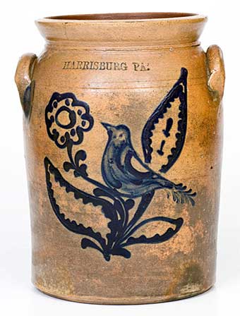 EXCEPTIONAL ONE-GALLON STONEWARE JAR, with Elaborate Bird-and-Floral Decoration, Stamped "HARRISBURG PA.," John Young, Harrisburg, PA, circa 1856-1858, cylindrical form with tooled shoulder, flared collar, and applied lug handles, decorated with a slip-trailed design of a bird perched on the stem of a flowering daisy plant. Slip-trailed spotted and circular details to blossom and cobalt accents to the edges and interiors of leaves. Bird features a highly-unusual brushed-cobalt body with undecorated areas delineating the wing and eye. The tail is depicted in a style distinctive to Young, resembling a leaf. Cobalt highlights to maker's mark and handle terminals. Excellent use of both slip-trailed and brushed elements to the design, a characteristic of Young's work, indicative of his New York training, but rarely seen in the output of other Harrisburg potters. The composition of this jar's design is unusual in its depiction of both a bird and flowering plant on the same piece. Any figural decorations by Young are considered rare, with this example boldly presenting its bird in solid cobalt, an uncommon depiction in the Harrisburg stoneware tradition. Coupled with the rarity of this jar's decoration and maker is a desirable one-gallon capacity to the vessel, a size that is typically difficult to find with figural decoration.