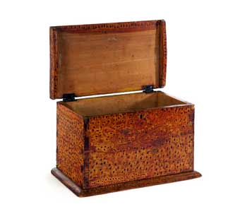 OHIO DECORATED DOCUMENT BOX. Possibly Holmes County, maple and pine. Dovetailed with original vinegar grain painting. Initialed and dated "AEH 1850". Minor imperfections. 9"h. 15.5"w. 8.5"d.