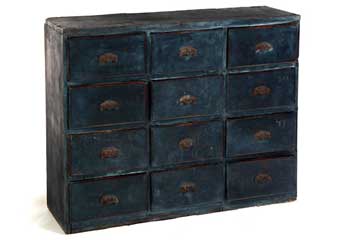 AMERICAN APOTHECARY, first half-19th century, walnut with pine secondary. Twelve dovetailed drawers with overlapping beveled drawer faces. Old blue paint and later bin pulls. 34.5"h. 42.5"w. 14.25"d.