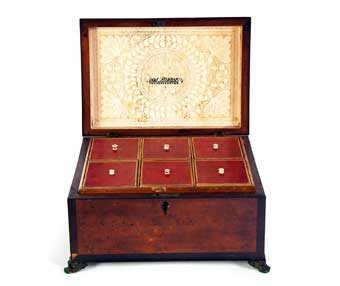 SUSANNAH BUDD SHOBER ACCESSORY BOX, Philadelphia, Pennsylvania, ca. 1820, bird's-eye maple, mahogany, and pine. Removable leather tray with six compartments and two drawers, and resting on brass paw feet. Retains its original dark finish.  6.75"h. 12.25"w. 8.75"d. Sold at Garth's, November 2008, lot 749.