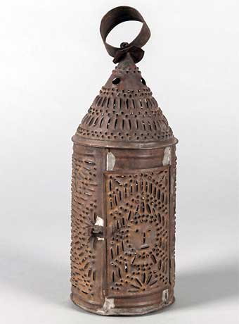 PUNCHED TIN LANTERN, 19th c., the door decorated with a whimsical face, 15'' h.