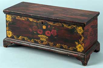 MINIATURE PAINTED PINE BLANKET CHEST, 19th c., with later Schoharie style decoration, 7.75'' h., 19'' w.