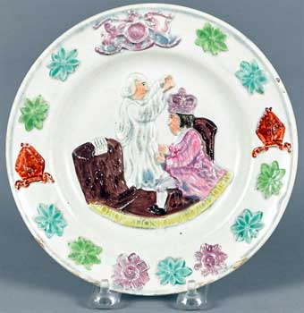 PEARLWARE PLATE, 19th c., with relief decoration of the Coronation of George the IV, 7.375'' diameter.