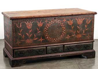 PENNSYLVANIA PAINTED PINE DOWER CHEST, dated 1776, retaining its original tulip decoration on a green ground, 27'' h., 47.5'' w.