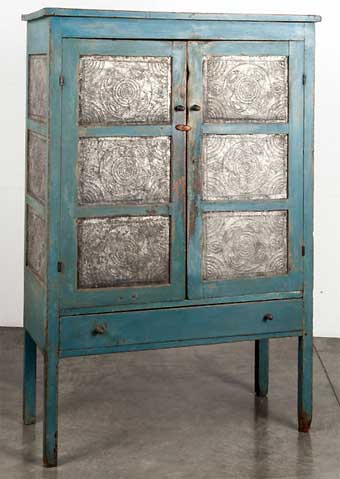 PAINTED PINE AND POPLAR PIE SAFE, 19th c., with punched tin panels, retaining an old blue surface, 59.25'' h., 38.25'' w.