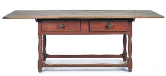 PENNSYLVANIA PAINTED PINE FARM TABLE, early 19th c., with a scrub top over a base with two drawers, resting on turned legs joined by a box stretcher, retaining an old red surface, 29" h., 82" w., 34" d. Provenance: Purchased at a farm sale in Finland, Montgomery County, Pennsylvania.